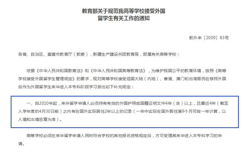 查看北京大學(xué)、清華大學(xué)過往幾年的國際生招生要求也會發(fā)現(xiàn),其中明確規(guī)定了國際生需持有效的外國護照或國籍證明文件4年(含)以上,且最近4年之內(nèi)有在國外實際居住2年以上的記錄。