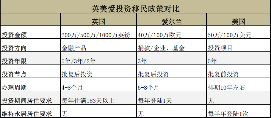 通過對(duì)比可以看出:英國(guó)投資移民門檻最高;美國(guó)需要在獲得批復(fù)前投資,投資風(fēng)險(xiǎn)較大,且排期極長(zhǎng)(目前美國(guó)EB-5區(qū)域中心項(xiàng)目處于暫停狀態(tài));愛爾蘭投資門檻居中,投資期限較短,辦理周期較快,居住要求也極低,僅需每年登陸1天(當(dāng)下疫情期間免除登陸要求)。
