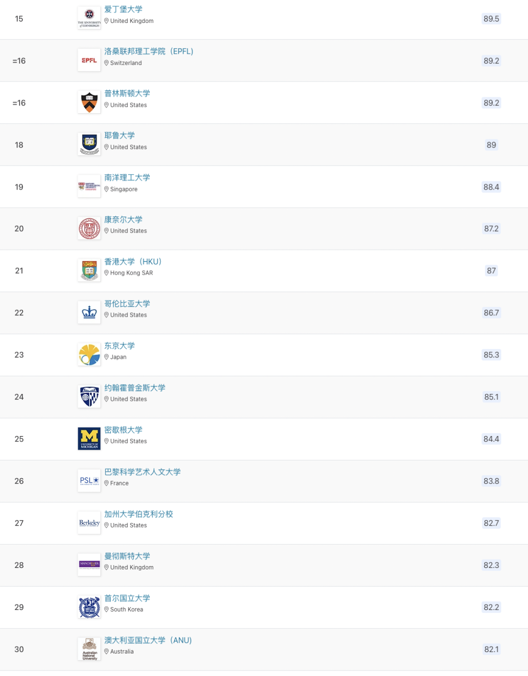 中國(大陸)目前有兩所大學進入世界前 15 名,北京大學(第 12 名)和清華大學(第 14 名)獲得了本榜單成立以來的最高排名。