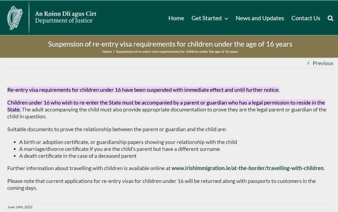 請注意,目前有關16歲以下兒童再入境的簽證申請,將在未來幾天同護照一起退還給客戶。有關陪同兒童旅行的更多信息,可通過以下網址進行查詢:www.irishimmigration.ie/at-the-border/travelling-with-children