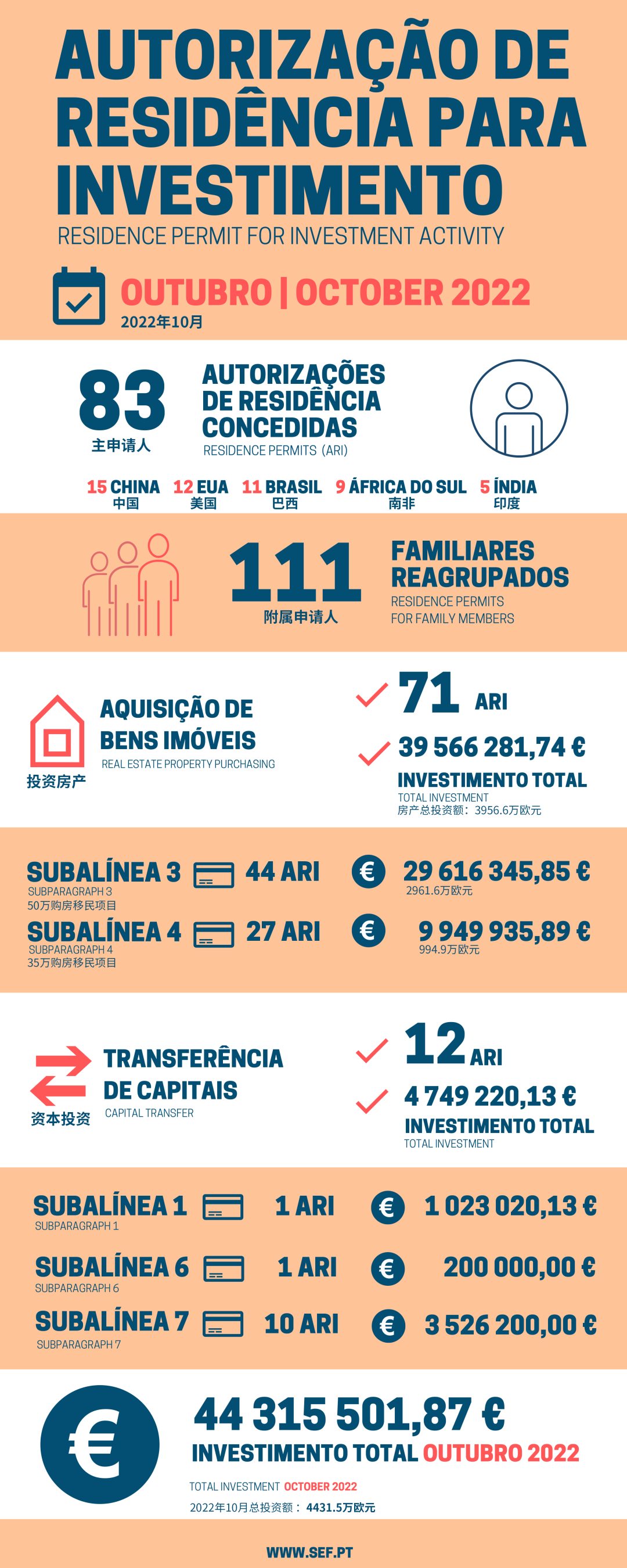 11月16日,葡萄牙移民局發(fā)布了10月的黃金簽證審批數(shù)據,共有83位主申請人和111位附屬申請人獲批,總投資額約4431萬歐元。