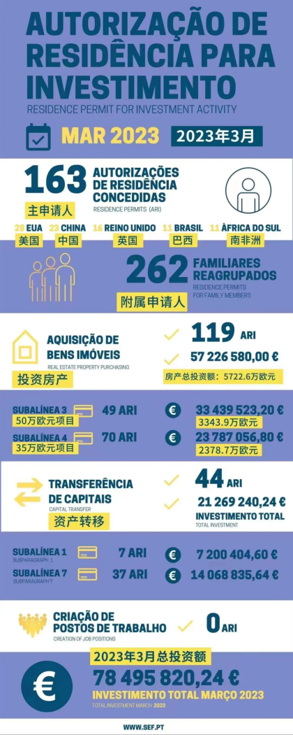 葡萄牙移民局(SEF)正式發布了黃金簽證的3月最新統計數據。2023年3月共有163位主申請人和262位附屬申請人獲批葡萄牙黃金簽證。獲批總人數為425人,總投資額約7849.5萬歐元。